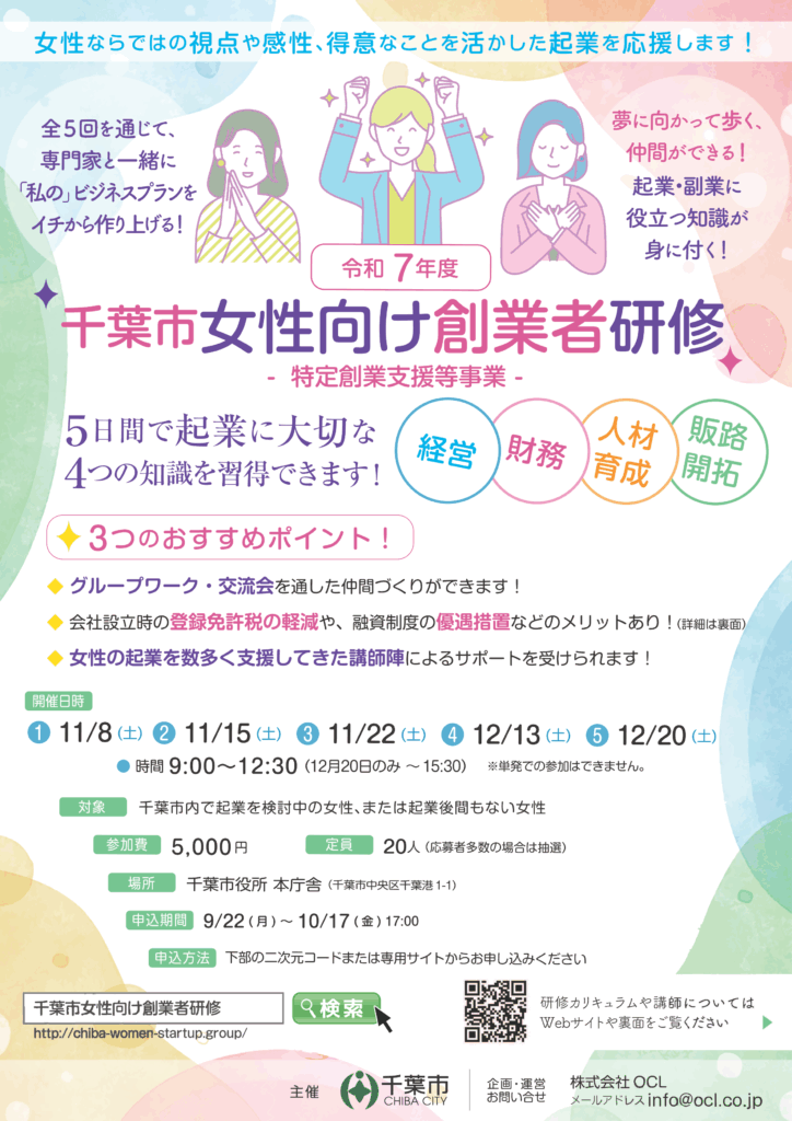千葉市では、女性ならではの視点や感性、得意なことを活かした起業を応援するため「女性向け創業者研修」を実施します。